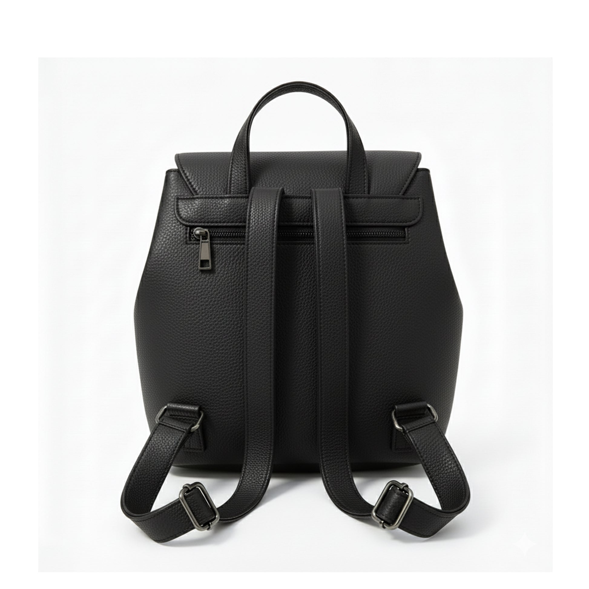 Features a secure main zipper + flap with snap & buckle, front pocket (20×11 cm), back