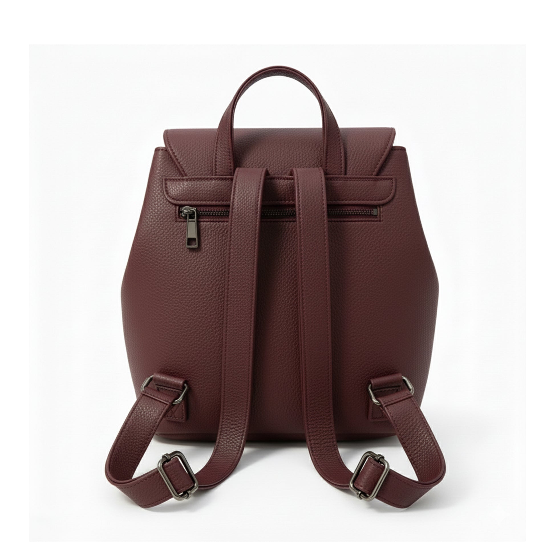 Features a secure main zipper + flap with snap & buckle, front pocket (20×11 cm), back