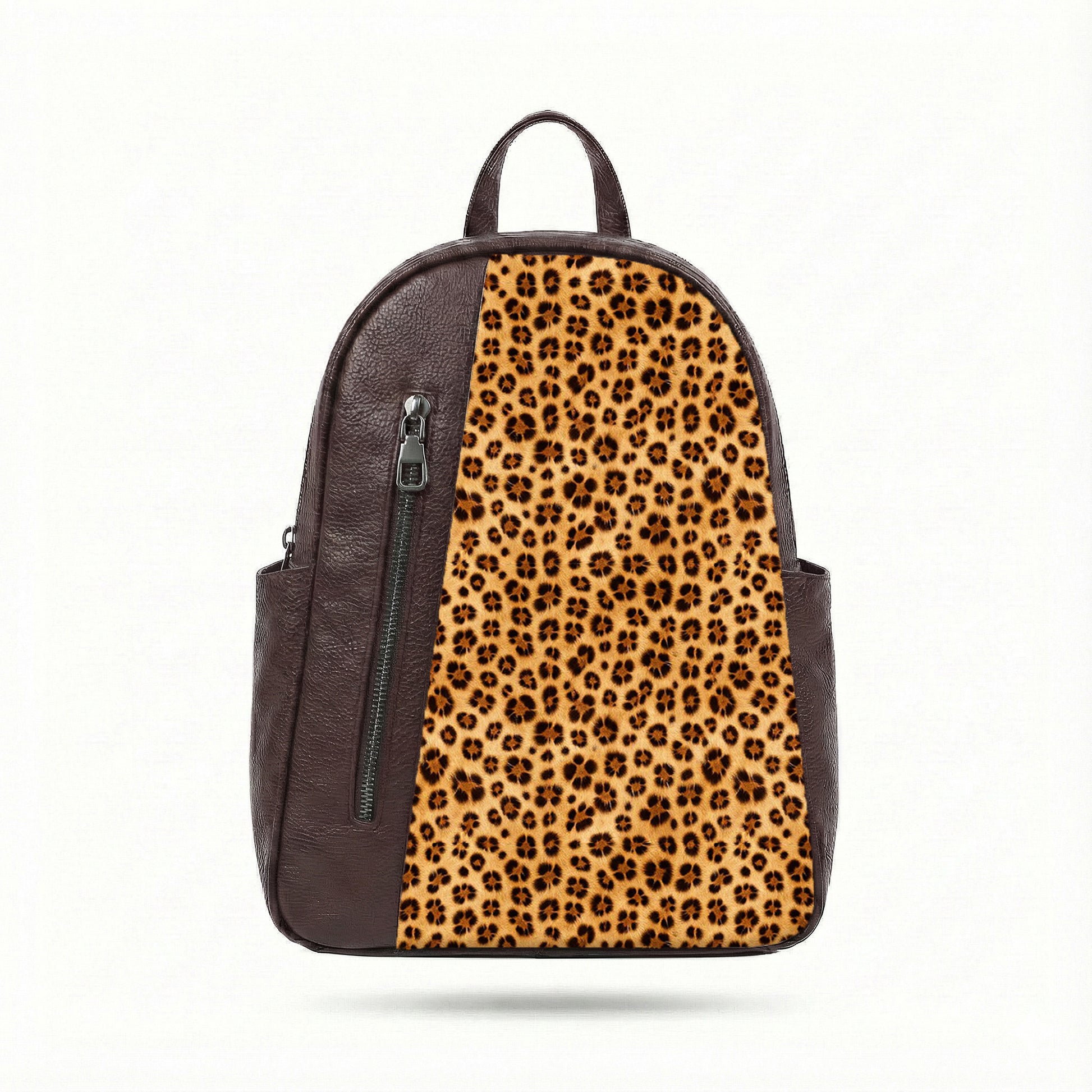 Crafted from a durable, high-quality leather material combined with printed Martin fabric for a striking contrast design. Features a spacious interior with two main compartments, a practical front pocket, and side pockets for quick access. Includes smart internal organization with an internal key hook and a secure back zip pocket for added safety.
