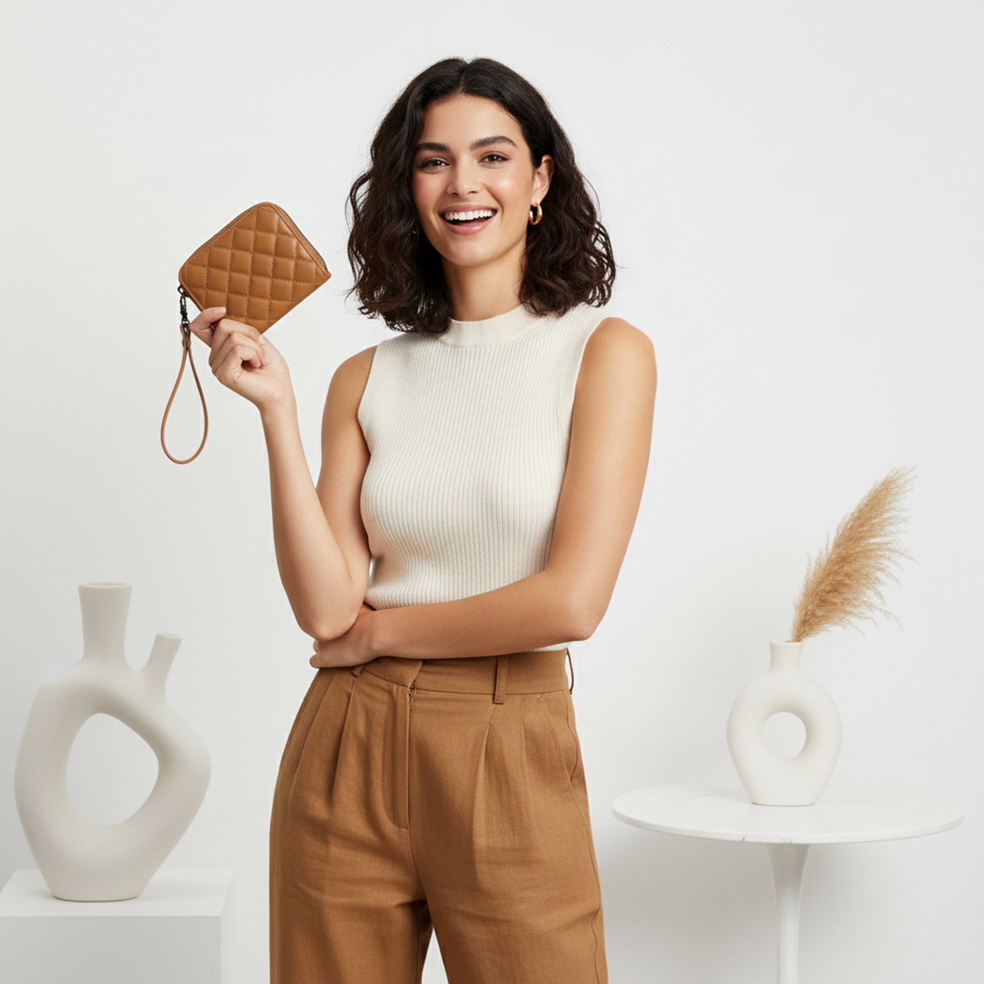 A durable metal zipper ensures full security, while the detachable wrist strap gives you the freedom to carry it with effortless modern style.