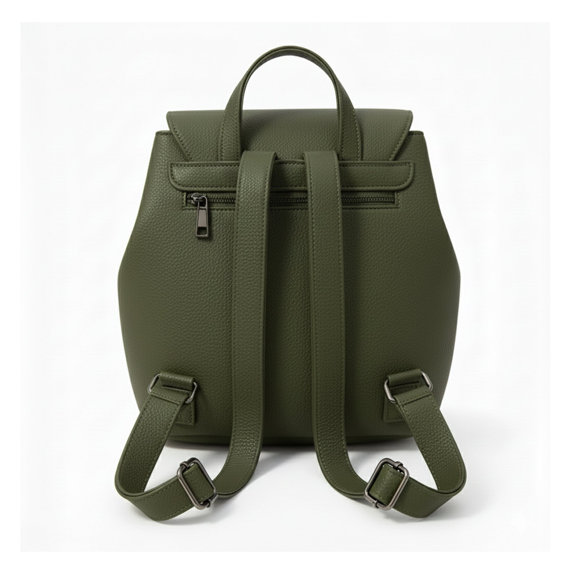 Features a secure main zipper + flap with snap & buckle, front pocket (20×11 cm), back