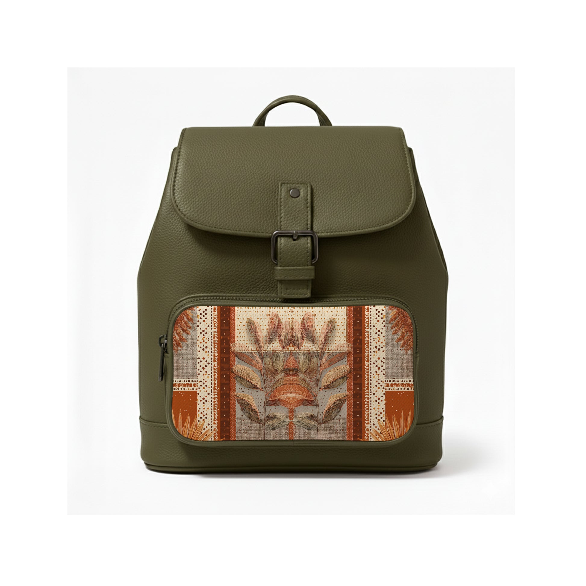 Features a secure main zipper + flap with snap & buckle, front pocket (20×11 cm), back