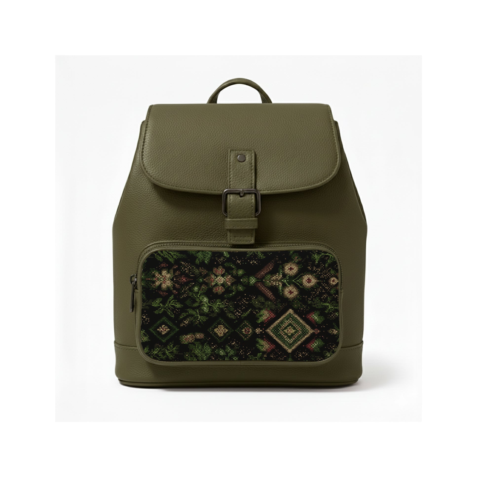 Features a secure main zipper + flap with snap & buckle, front pocket (20×11 cm), back
