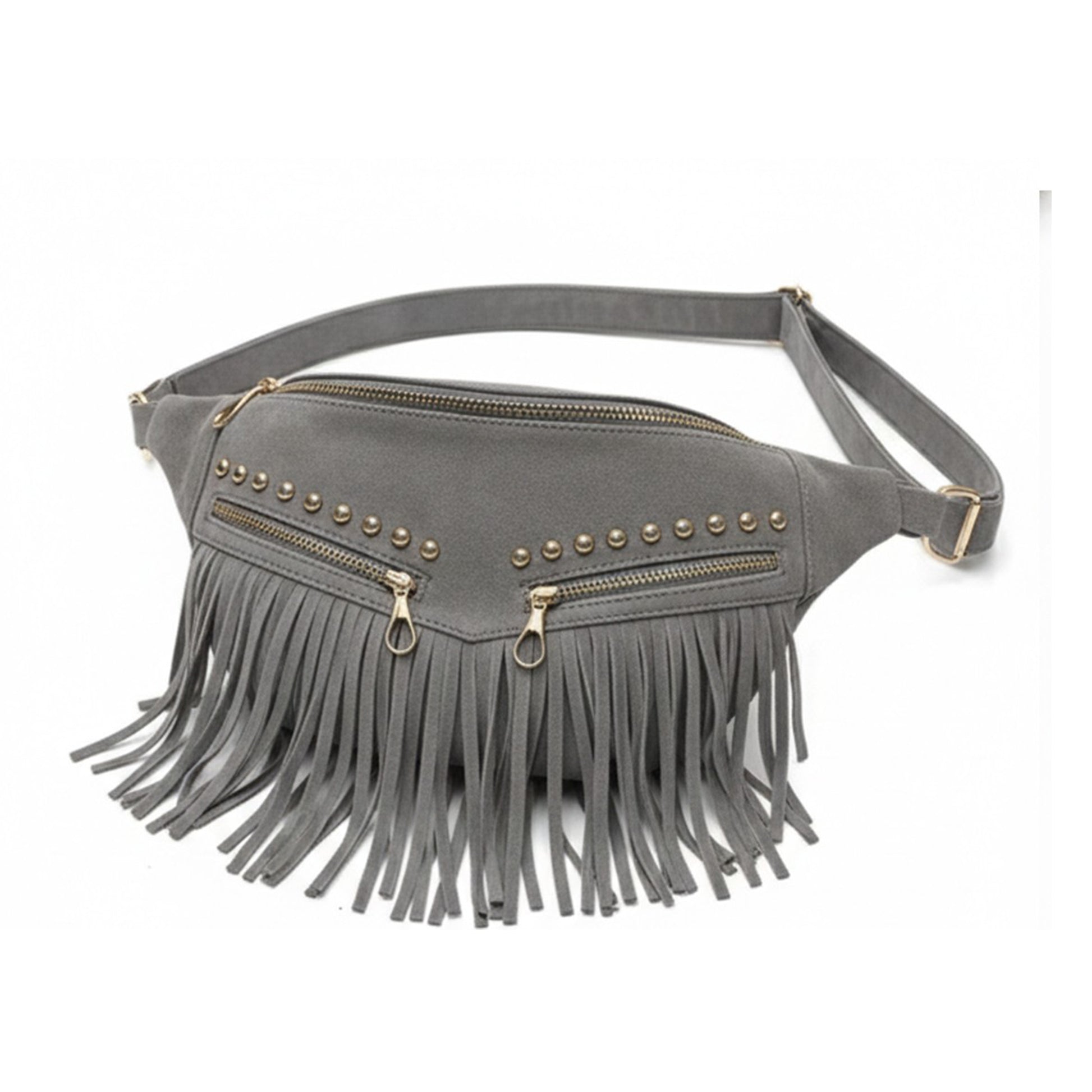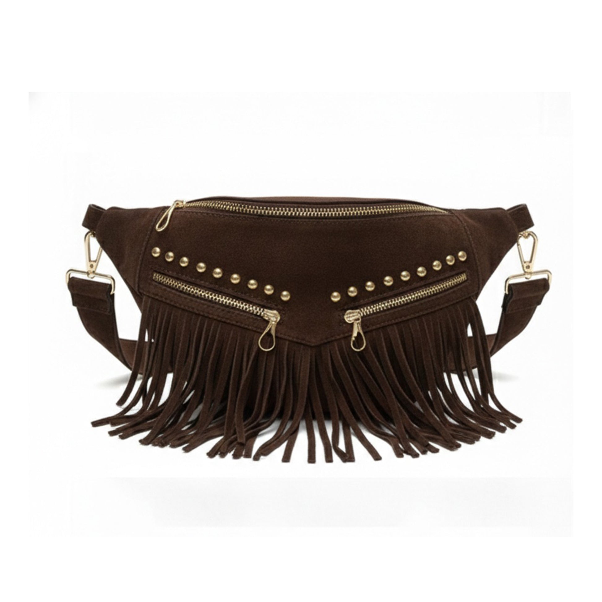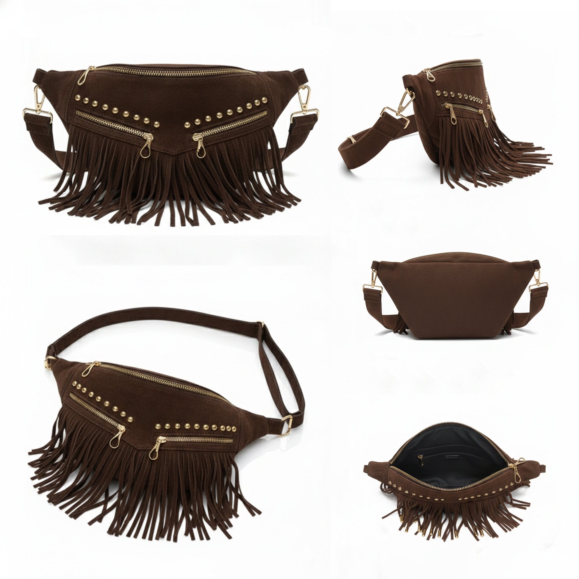 Crafted from premium heavy suede leather with a rich texture, finished with 17 cm fringe detailing for added movement. Features double external zippers for quick access, along with a soft jersey lining and smart internal organization. Can be worn as a crossbody or waist bag for versatile styling.