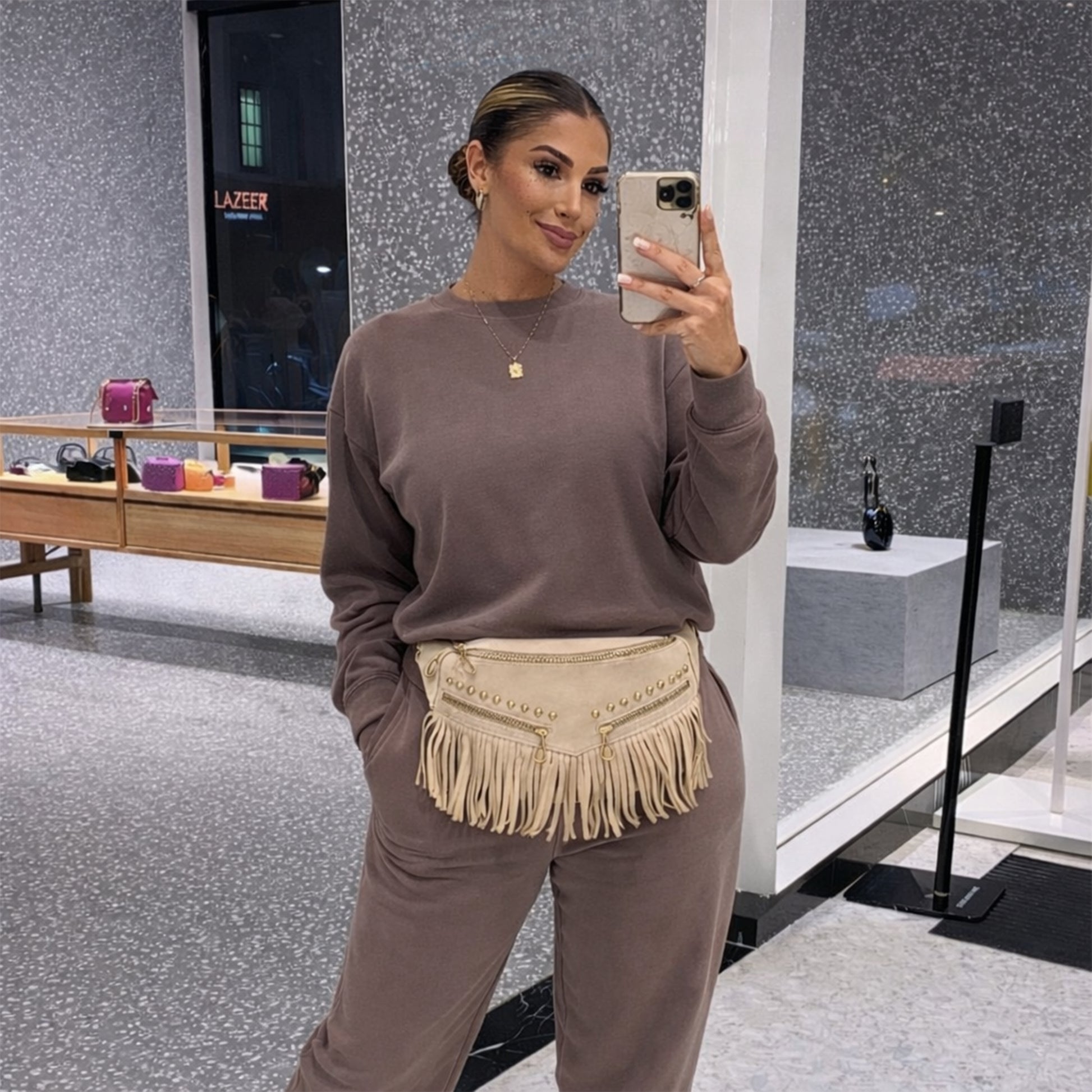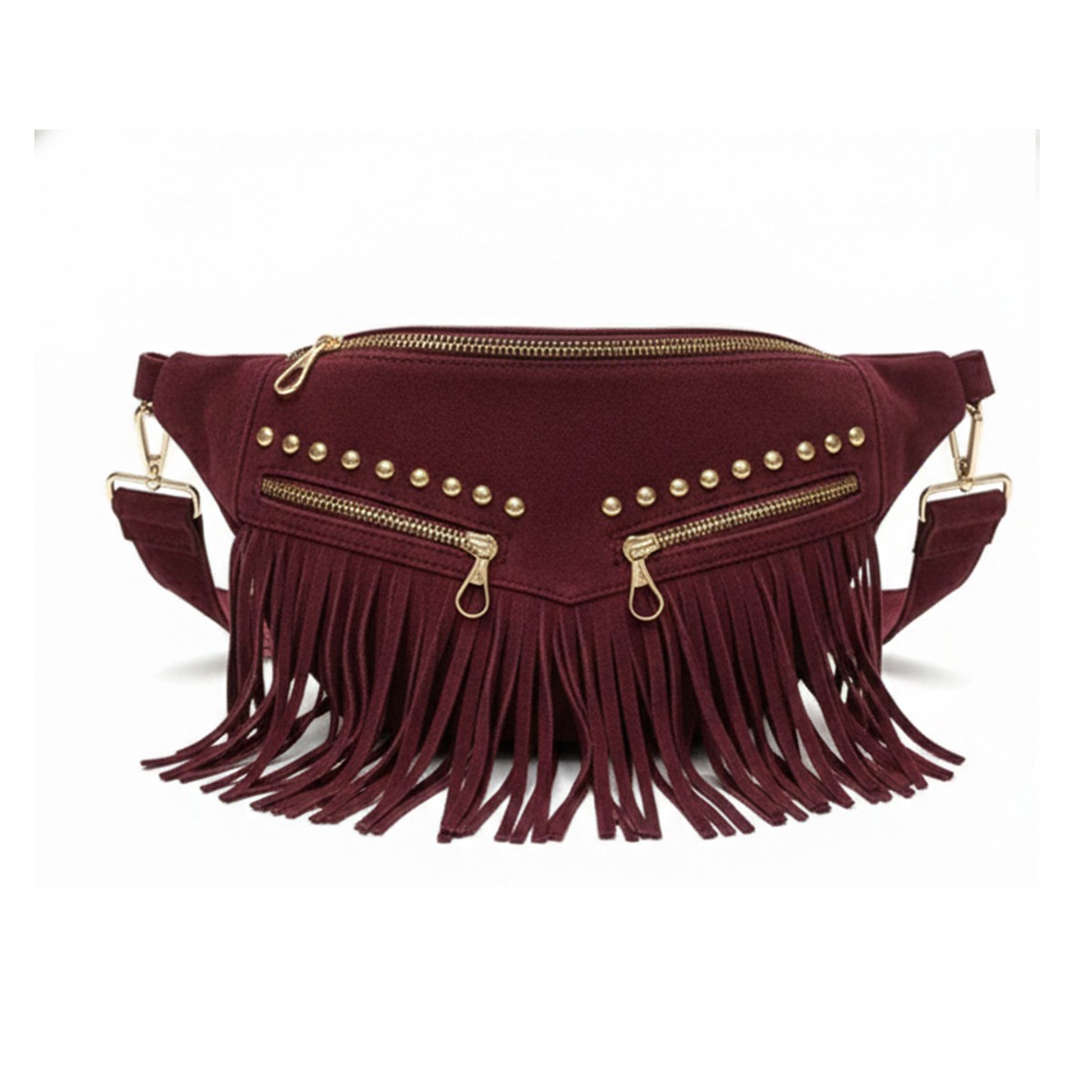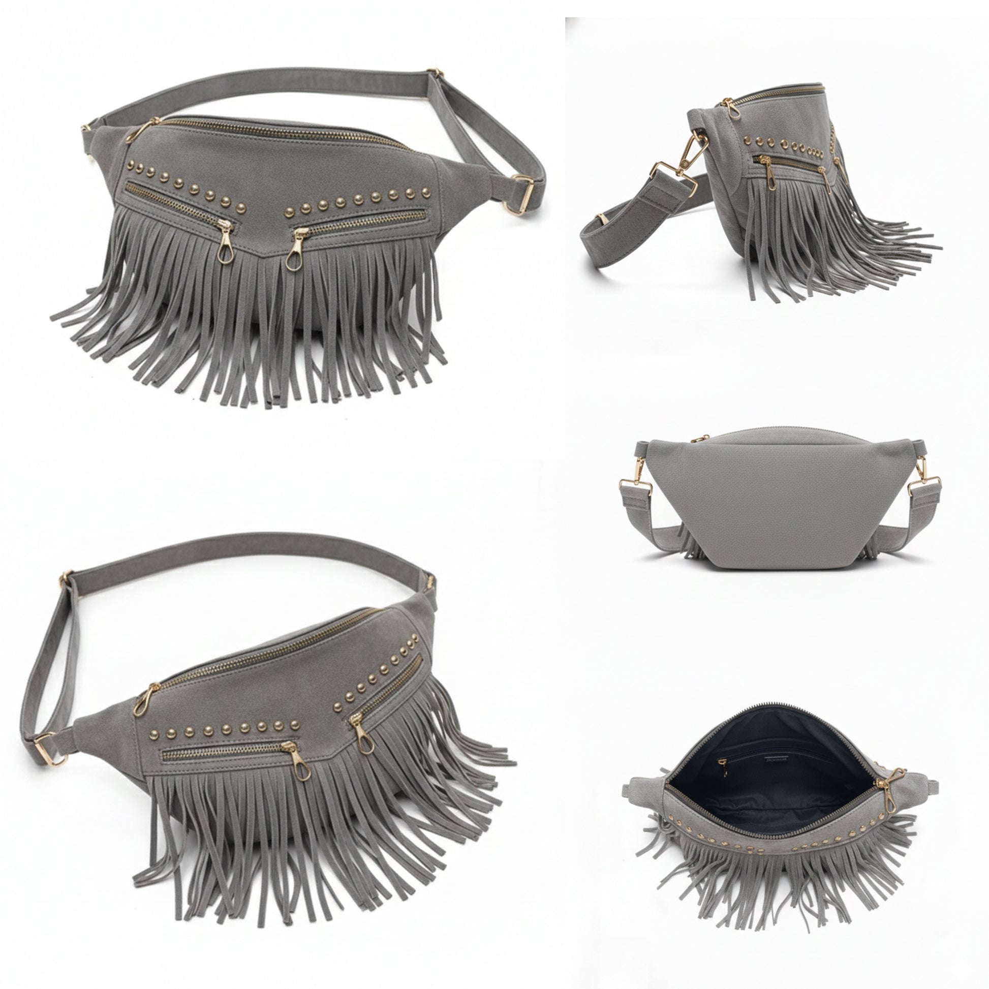 Crafted from premium heavy suede leather with a rich texture, finished with 17 cm fringe detailing for added movement. Features double external zippers for quick access, along with a soft jersey lining and smart internal organization. Can be worn as a crossbody or waist bag for versatile styling.