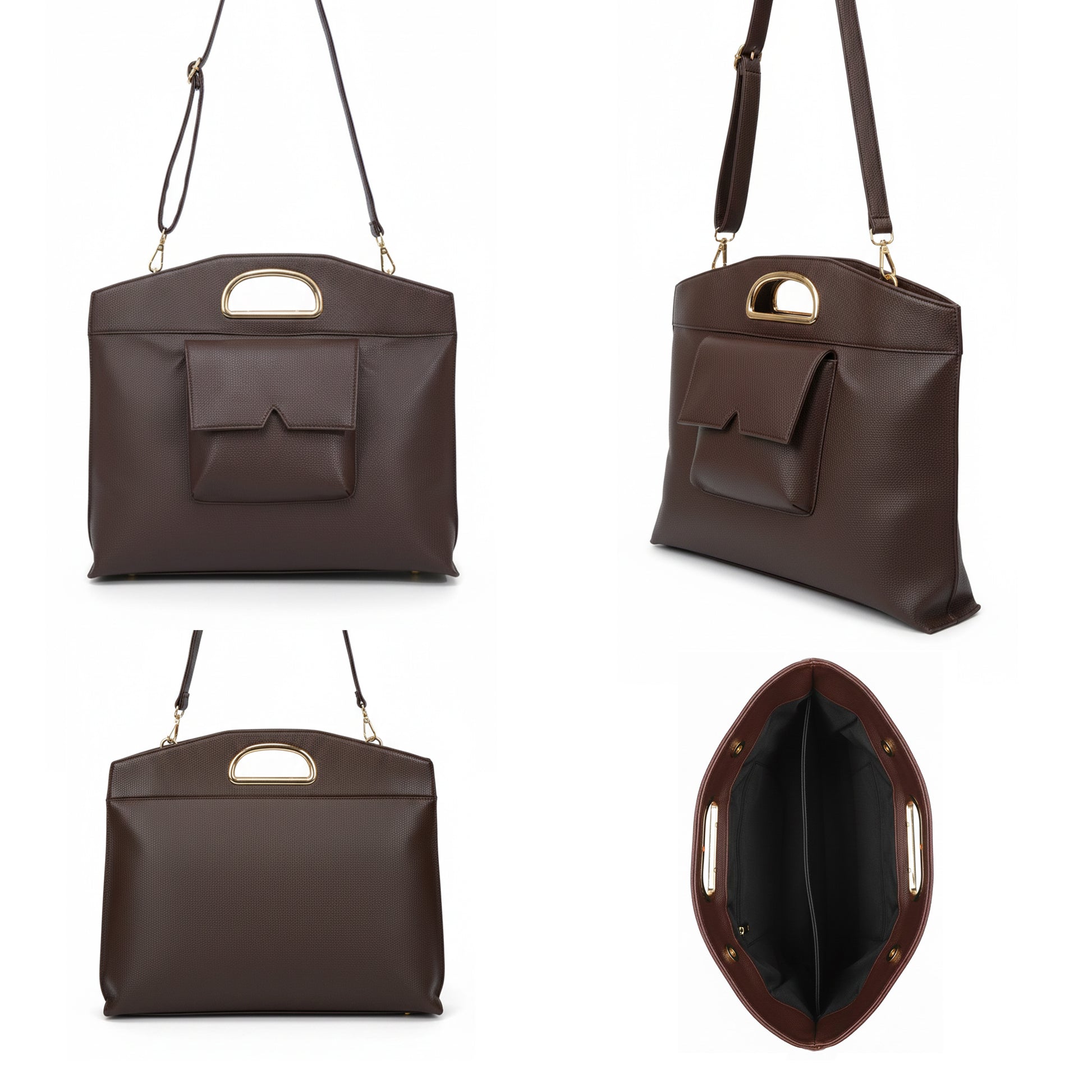 Crafted from a durable, high-quality leather material with a strong, shape-holding structure. Features a large interior suitable for laptops up to 15.6 inches, with padded inner pockets for protection and easy organization. Finished with a cut-out integrated top handle for hand carry, a wide adjustable shoulder strap for added comfort, and a front magnetic pocket for quick access.